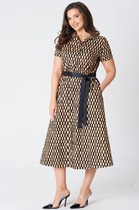 Стильное платье прямого силуэта выполнено из ткани "джинса". Рукав-реглан длиной 3/4 присборен на эластичную резинку. Горловина оформлена воротником-стойка. По переду планка с застежкой на петли и пуговицы. В боковых швах функциональные карманы. Низ ровный, без разрезов. Пояс из основной ткани в комплекте.