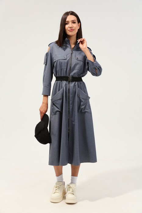 Платье в стиле "сафари" длиной макси со свободной юбкой и укороченными рукавами. Застёжка центральная на молнию, съемный пояс на резинке. По переду платья расположено четыре накладных функциональных кармана. По плечам декоративные паты. Размер на модели -44, рост модели 175 см.