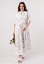 Шифоновое платье, которое идеально подойдёт для создания лёгкого многослойного образа. Платье состоит, из двух слоёв. Верхний слой выполнен из нежного шифона дизайна «веточки», нижний - это комбинация из трикотажной лёгкой подкладки. Платье свободного кроя «А»-силуэта с втачным длинным рукавом. Округлый вырез горловины по переду. По спинке средний шов, переходящий у горловины в разрез на завязке. К нижней части лифа платья ярусами нашиты воланы в сборку, что придаёт платью воздушности и изящества. С шифоновым платьем отлично получаются многослойные образы — это прекрасный вариант для всех сезонов. Длинное шифоновое платье можно комбинировать с удлиненными свитерами, короткими куртками, бомберами, с обувью на каблуке или на плоской подошве.