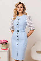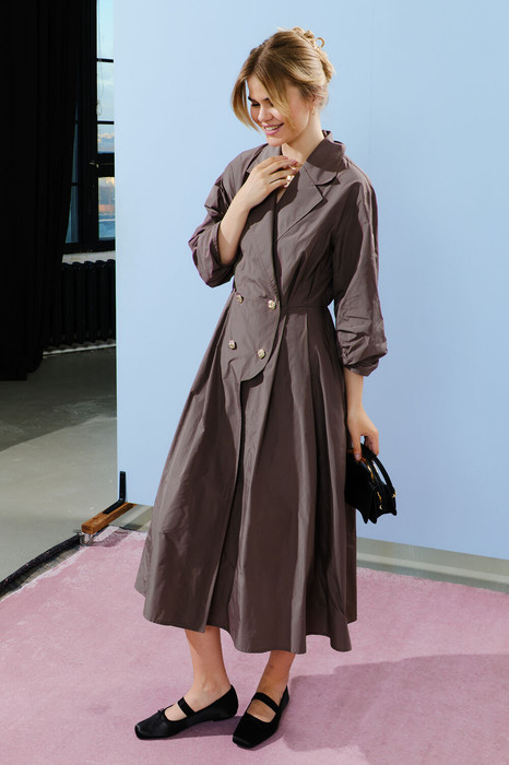Платье полуприлегающего силуэта выполнено из ткани тафта. Линия плеча спущена. Рукав 3/4 по низу рукава складки. Воротник пиджачного типа с воротником и лацканом, застёжка двубортная на петли и пуговицы, Линия талии отрезная, от подреза по лифу и юбке талии глубокие складки. В боковых швах карманы, по спинке в подрез вставлена резинка.