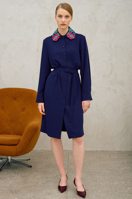 Платье-рубашка прямого силуэта с центральной застежкой на петли и пуговицы. Рукав длинный втачной с отрезной манжетой и застежкой на петли и пуговицы. Воротник рубашечного кроя, декорирован вышивкой. По спинке отрезная кокетка и складки. В комплекте съемный пояс.