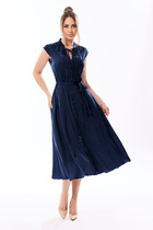 Платье полуприлегающего силуэта, отрезное по талии. Рукав втачной, по низу рукава манжета с застежкой на петли и пуговицы. Воротник рубашечного кроя, по переду
