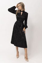 Стильное платье из плательной струящейся ткани прилегающего силуэта. Горловина фигурной формы. По среднему шву спинки потайная молния. Перед отрезной по линии талии. Лиф переда с талиевыми вытачками и имитацией запаха. Юбка переда с талиевыми вытачками и декоративным запахом. Спинка с вытачками по талии. Рукав втачной длиной 3/4. В комплект входит съемный пояс.