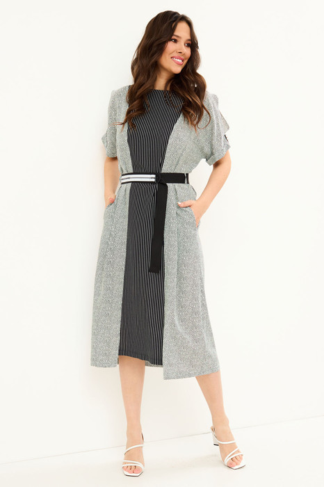 Стильное платье прямого силуэта, с цельнокроеными рукавом, дополненым пришивной ратой с пуговицей. Платье приталено за счет съемного пояса (в комплекте). По спинке застежка на петлю-пуговицу. Длина платья от плечевого шва 122 см. Длина рукава 26см.