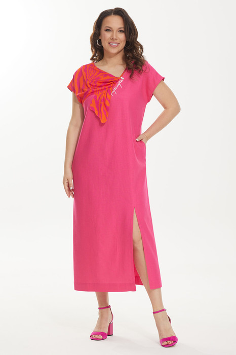 Яркое летнее платье из натуральной смесовой ткани. Платье свободного прямого кроя с коротким цельнокроеным рукавом. Горловина с V- образом, слегка смещенным, вырезом. Обработана пришивным элементом из яркого штапеля (100% вискоза) в виде крыльев бабочки. В боковых швах расположены удобные карманы. Спереди слева расположен разрез. Длина платья от плечевого шва 129см. Длина рукава 15см.