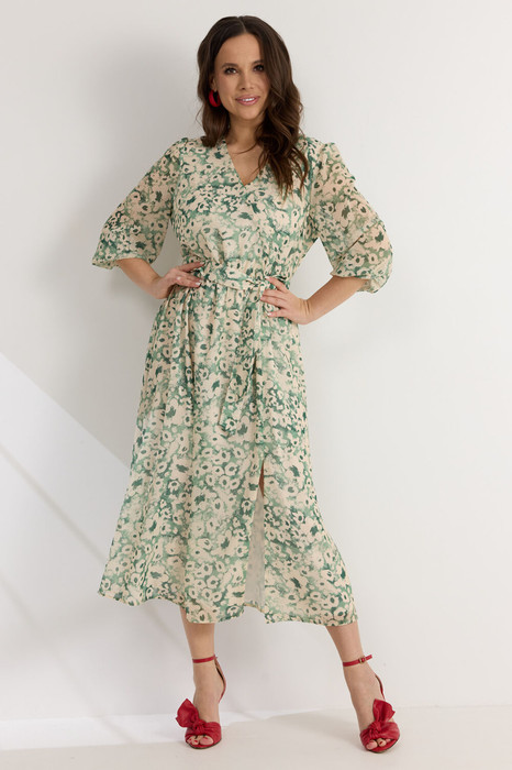 Легкое воздушное платье приталенного кроя с расширенной книзу юбкой. То талии платье отрезное, присборено на эластичную тесьму. Дополнено съемным поясом , выполненным из основной ткани. Рукав втачной, 3/4, по низу присборен на эластичную тесьму. Горловина с V-образным вырезом. Спереди платье дополнено разрезом. Длина платья от плечевого шва 127см. Длина рукава 47см.