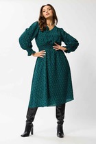 Платье из плотного фактурного трикотажа полуприлегающаго силуэта с округлой горловиной, обработанной бейкой. Рукав втачной одношовный, зауженный книзу. На полочке чуть выше талии подрез. Перед платья украшен принтом. По спинке застежка-молния и шлица.