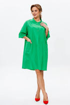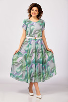 Платье полуприлегающего силуэта. По переду отрезное по линии талии с рельефами, с асимметричной фигурной горловиной. По низу переда фигурный подрез, заканчивающийся разрезом по левой стороне переда. По спинке средний шов с застежкой на молнию и талиевые вытачки. Рукав втачной, зауженный книзу.