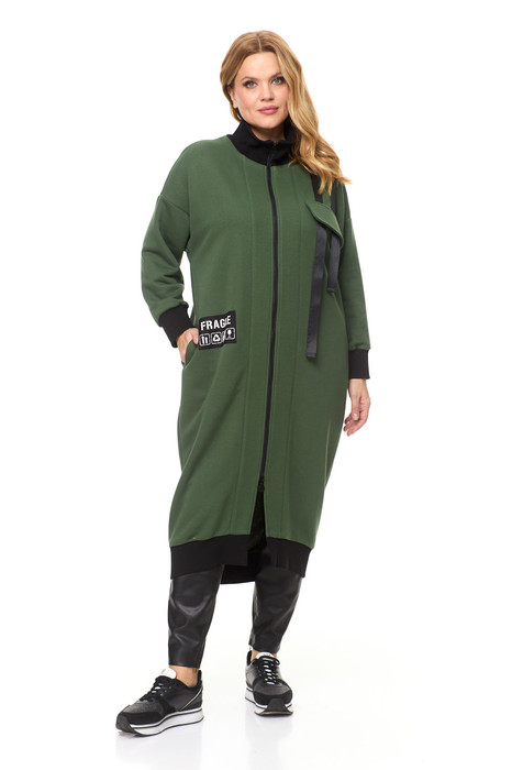 Универсальное трикотажное платье выполнено из футера трехнитка. Платье-кардиган станет идеальным и интересным изделием для создания повседневного образа. Платье длиной за колено, с центральной застежкой на молнию по переду, воротник — высокая стойка. Спинка у изделия цельная, плечо спущено, рукав втачной длинный одношовный на манжете, в боковых швах два функциональных карамана. Воротник, низ и манжеты выполнены из отделочного контрастного трикотажа. Декором платья служит нашивка и клапан-обманка, украшенный лентами. Платье-кардиган прекрасно сочетается с любой по стилю обувью, а также его с легкостью можно комбинировать с юбками и джинсами. Длина изделия по спинке 119 см (+-1 см), длина рукава от горловины