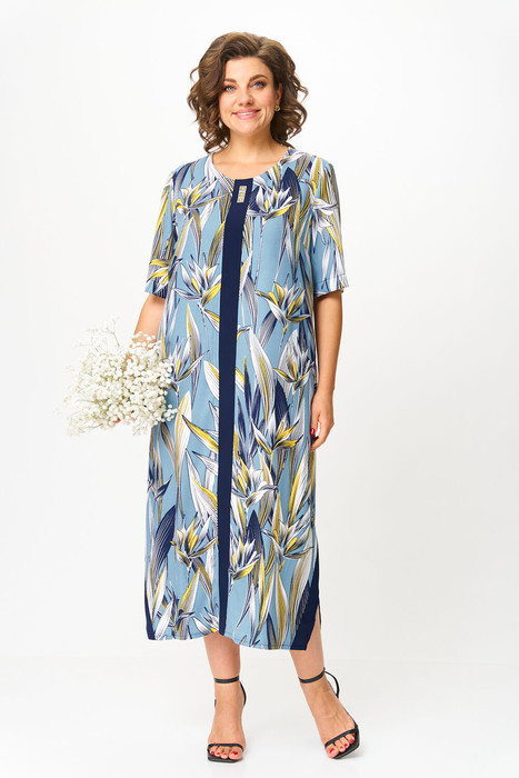 Платье в стиле casual предназначено для повседневной носки, прекрасно сочетается с любой по стилю обувью. Платье выполнено из плотного шифона, свободного кроя, ниже колена, рукав укорочен. В качестве декора по переду изделия — вставлена планка из контрастной ткани, на планке нанесены стразы. По бокам изделия — разрезы, которые также обработаны контрастной тканью, в цвет декоративной планки.