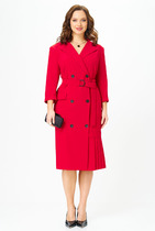 Спинка цельная, а передняя часть украшена нагрудными вытачками и левым рельефом с разрезом внизу. В рельеф вставлен декоративный волан-цветок из отделочной плиссеровки, который служит ярким акцентом и добавляет модели оригинальности. Длина платья — 7/8, что делает его универсальным для различных сезонов и ситуаций. По правой стороне расположен накладной карман — практичный элемент, дополняющий дизайн и удобство.