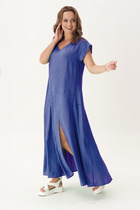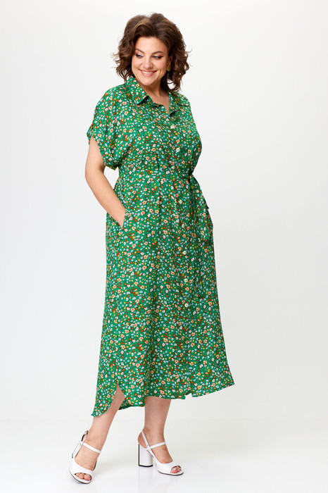 Платье рубашечного типа, свободного кроя  выполнено из натуральной вискозной ткани. Универсальность кроя и натуральная ткань сделают его любимым изделием Вашего гардероба в весенне-летнем сезоне. По переду сверху застегивается на пуговицы, снизу сбоку разрез, по спинке длиннее. Рукав короткий цельнокроеный приспущенный на отложенной манжете. Благодаря встречной складке на спинке имеет небольшое клешение. По желанию фиксируется поясом из основной ткани, который идет в комплекте. Длина изделия по спинке от горловины 130 (+/-1) см. Изделие подойдет на рост 170 см.