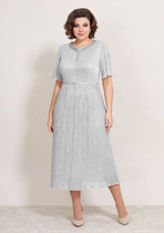 Эффектное женское платье, полу-прилегающего силуэта, выполнено из плиссированной ткани, на трикотажной подкладке. Лиф платья отрезной по линии талии, горловина округлой формы, на обтачке, также на горловине обработаны втачные планки из атласа в тон и декорированы стразами. По линии горловины выполнена вставка из сетки, что придает платье еще больше эффектности, по линии талии втачной пояс из основной ткани, декорирован стразами. Юбка присборена по линии талии и расклешена к низу, спинка отрезная по линии талии, со средним швом и вытачками. Рукав втачной, выполнен з основной ткани, укороченный. Стильное платье, то, что надо для торжественного мероприятия!