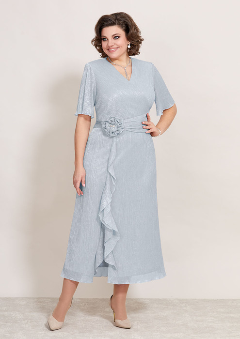 Нарядное женское платье полу-прилегающего силуэта, выполнено из плиссированной ткани, на трикотажной подкладке. Горловина V-образной формы, на обтачке, лиф платья отрезной по линии талии, с втачным поясом из основной ткани, декорирован съемным цветком. Юбка А-образного силуэта, на юбке выполнен вертикальный подрез, с разрезом по низу и вставками воланов из основной ткани. Спинка со средним швом и вытачками, рукав втачной, оптимальной длины, выполнен из основной ткани. Эффектное платье из нежной и эффектной ткани прекрасно подойдет для любого мероприятия.