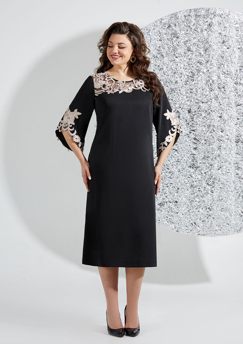 Женское платье полу-прилегающего силуэта, выполнено из текстиля и кружева. На полочке обработана кокетка из кружева, горловина округлой формы, окантована, шов притачивания кокетки декорирован аппликацией. Полочка расклешенная к низу, с нагрудными вытачками, выполнена из текстиля. Рукав втачной из текстиля, оптимальной длины, расклешенный к низу и декорирован аппликацией из кружева. Спинка выполнена из текстиля, со средним швом и вытачками, в среднем шве потайная молния. Элегантное платье утонченно подчеркнет ваш образ!