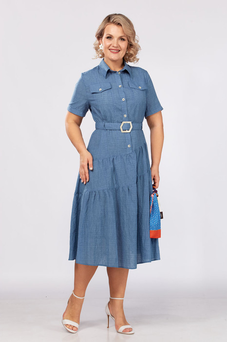 Стильное платье полу-прилегающего силуэта, выполнено из летней ткани с эффектом «тай-дай». Горловина платья обработана воротником, застежка по переду на планку с пуговицами. На полочке обработаны кокетки и рельефы с двойной отстрочкой, также в шов кокетки вставлены клапаны. Юбка платья имеет ассиметричный подрез ниже линии талии, состоит из двух, присбореных воланов. Спинка идентична полочке, с кокеткой, рельефами, по линии талии настрочены шлевки и в комплект входит съемный пояс из основной ткани, с пряжкой. Рукав втачной, укороченный, на спинке выполнена объемная аппликация. Стильное платье для ценителей комфорта в сочетании с оригинальным кроем!