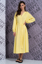 Платье женское А-силуэта длины миди. Отрезное по линии талии, на кулисе. Кокетка переда спинки из отделочной натуральной льняной ткани. Мужду кокеткой и лифом настрочено кружево. Лиф платья с застежкой на пуговицы и нависные петли. Карманы в боковых швай. Воротник стойка, рукав втачной со сборкой по окату, заканчивается воланом на резинке-венгерке. Платье на подкладке из хлопка с регулируемыми брителями.