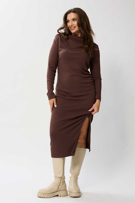 Платье трикотажное полуприлегающего силуэта, перед с фигурным подрезом, заканчивающийся разрезом. На плечевом шве заложены мягкие складки. По левому боку - небольшая сборка. Рукав втачной одношовный.