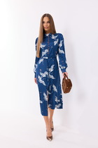 Платье женское приталенного силуэта, отрезное по линии талии. По лифу переда и спинки расположены рельефы. Юбка расклешенная с разрезом по переду. Застежка на потайную тесьму-молнию в среднем шве. Дополнительной застежкой служит шнуровка корсетного типа по спинке. Рукава съемные, держатся на резинке.
