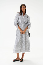 Платье женское свободное комбинированное из двух различных по фактуре тканей. Плечи спущены на кулисе и фиксирующих завязках. Горловина V-образная с широкой планкой по переду и спинке. В платье по низу широкий волан. В боковых швах карманы. Платье без подкладки. Дополнением служит пояс.