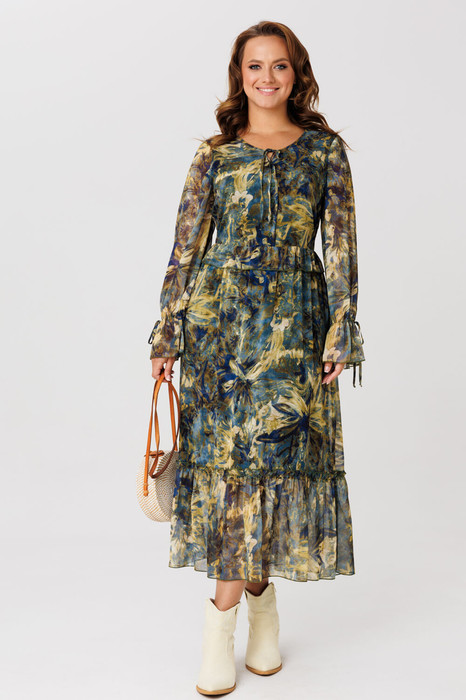 Нарядное женское платье прямого силуэта, выполненное из плательной шифоновой ткани (не тянется), на трикотажной подкладке (тянется). Платье отрезное по линии талии. По лифу переда центральная застежка на петли-пуговицы. Горловина округлой формы, обработана окантовкой, переходящей в завязки. В горизонтальный подрез по переду вставлен волан. Нижняя часть платья присборена по линии подреза. По низу платья – настрочной широкий волан. Рукава втачные, одношовные. Низ рукава собран резинкой, по центру рукава декоративная завязка-бантик.