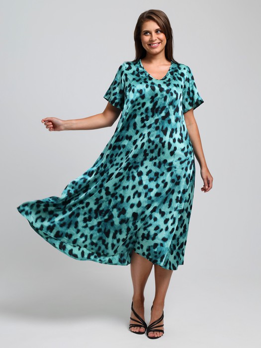Платье женское из тканого полотна «искусственный шёлк полиэстер» с набивным рисунком, свободного покроя, удлиненное, по боковым швам расклешенное книзу, с V-образным вырезом горловины, окантованным основным материалом и короткими втачными рукавами.