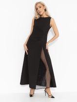 Платье комбинированное длиной макси, отрезное по линии талии с цельнокроеными рукавами. Застежка центральная с цельнокроеными планками на петли и пуговицы. Верхние части переда и спинки с вертикальными рельефами, начинающимися от линии плеча. Бантовая складка расположена по центру, боковые складки направлены от центра изделия в сторону бокового шва. Рукав цельнокроеный с боковыми частями переда и спинки с углубленной до линии талии проймой. По центру оката рукава сборка. Нижний срез рукава обработан притачной манжетой. Застежка манжеты на петли и пуговицы. Платье по линии талии собрано на резинку. Горловина изделия круглой формы, обработана воротником-стойкой, с застежкой на петли и пуговицы. Платье дополнено съёмным бантом. Бант съёмный, продевается в шлевки, расположенные на воротнике-стойке. В комплект к изделию идёт ремень из экокожи.