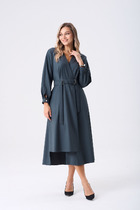 Оригинальное платье макси комбинированное. Лиф прямого кроя, имеет округлый вырез горловины, по линии талии собирается на кулису. По спинке застёжка на потайную молнию. В боковых швах карманы. Рукава-фонарики собраны на резинку. Юбка трапецивидной формы сводного кроя.