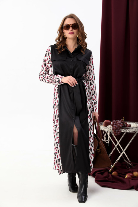 Классическое платье-рубашка прямого кроя в пол. Воротник отложной на стойке. Линия плеча немного приспущена. По груди расположены клапаны. Застёжка центральная на петли и пуговицы. Объёмный рукав с манжетой. Фигурные боковые вставки и рукава из отделочной ткани. Пояс из основной ткани входит в комплект.