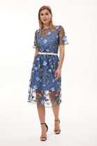 Платье макси комбинированное, двухцветное. Лиф выполнен из трикотажной ткани, от низа переда заложена складка, проходящая через плечевой шов до низа спинки. По линии талии с двух сторон настрочены кулисы с двух сторон со шнурком. Вырез горловины полукруглый. Рукава втачные, собраны на резинку. Юбка на резинке, драпирующаяся, расширенного силуэта.