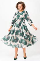 Платье прямого свободного силуэта длиной макси. Рукав летучая мышь с притачным манжетом. Воротник- объемный хомут. Перед состоит из пяти частей : правой верхней части переда, левой верхней части переда, центральной части переда, нижней части переда и отлетной фигурной  детали нижней части переда. На нижней части переда, по левой стороне накладной карман и карманы в боковых швах. Спинка состоит из трех частей: левой правой части спинки, правой верхней части спинки, нижних частей спинки с заходом одна на одну по центру низа. В комплект к платью ремень не идёт.