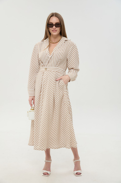 Платье полуприлегающего силуэта, отрезное по талии с объемной юбкой. Перед с глубоким запахом по талии, с защипами под грудью, с настрочной планкой. Спинка с плечевой кокеткой, складкой по центру и кулисой на талии с эластичной тесьмой. Юбка на спинке со сборкой по талии, на переде с глубокими складками. Рукав рубашечного кроя, с встречной складкой по окату и притачной манжетой с петлей и пуговицей. Воротник сорочечный с отрезной стойкой. Застежка на петли и пуговицы на притачном поясе переда. Изделие на подкладке.