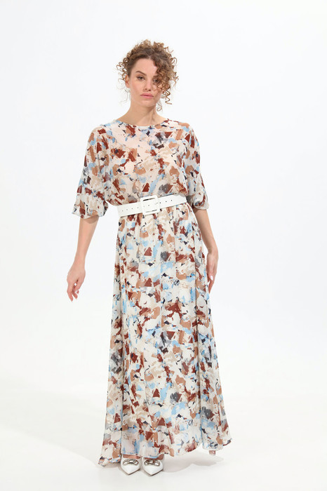Платье длиной макси с рукавами фасона "летучая мышь", отрезное по линии талии, на резинке. Рукав три четверти с фиксирующей резинкой по низу. Полукруглая горловина, застежка на петлю и пуговицу по спинке. Юбка - солнце. Платье на подкладке. В комплект к изделию идёт съёмный ремень из экокожи.