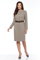 Платье женское полуприлегающего силуэта, выполнено из трикотажного полотна с фактурной лицевой стороной «люрекс». Модель с карманами в боковых швах, на трикотажной подкладке, с плечевыми накладками. Перед с нагрудными вытачками, направленными от пройм. В верхней части среднего шва спинки расположена застежка на тесьму-«молнию» (50 см), в нижней - разрез. Круглая горловина оформлена съемным воротником, декорированным спереди пришивными камнями. Рукав длинный, втачной, низ оформлен съемной манжетой с разрезом. Воротник и манжеты выполнены из сатина и пристегиваются к изделию при помощи прорезных петель и пуговиц.