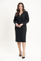 Платье женское, приталенного силуэта, выполнено из сетки-гофре с нитью «люрекс». Модель на трикотажной подкладке, без застежки и плечевых накладок. Платье отрезное по линии талии, с полуприлегающим лифом и расширенной к низу юбкой; для лучшего прилегания в области талии на внутренний шов настрочена узкая эластичная лента. Перед дополнен задрапированным поясом с перекрутом, концы которого входят в боковые швы. По плечевым швам, горловине и подрезу талии – сборка. Горловина округлая, окантована узкой косой бейкой из основного материала. Рукав короткий, расширенный, с фигурным низом, переходящим в разрез, края которого по окату скреплены на запах. Длина платья (от горловины спинки) – 131 см, длина платья (от талии спинки) – 92 см; длина рукава – 30 см.