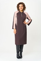 Платье женское приталенного силуэта, выполнено из вискозного полотна. Модель без подкладки, без плечевых накладок. По линии талии спинки и переда -- отрезной пояс с широкой эластичной лентой внутри; по середине пояса прострочена отделочная строчка. Перед с внешней застежкой на 8 петель и 8 пуговиц; по линии талии – дополнительная внутренняя застежка на 1 пуговицу. В верхней и нижней части переда настрочены фигурные накладные карманы с бантовой складкой посередине и клапаны, застегивающиеся на 1 петлю и 1 пуговицу. Горловина оформлена отложным воротником на отрезной стойке. Рукав короткий, реглан; дополнен патой, зафиксированной на плечевом шве двумя шлевками и пуговицей. Длина платья – 110 см; длина рукава (от горловины) – 32 см.