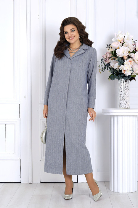 Платье женское прямого силуэта, выполнено из трикотажного полотна «елочка». Модель без подкладки, без застежки. В боковых швах платья обработаны карманы. По переду – имитация потайной бортовой застежки; от плечевых швов к центру груди направлены вытачки. Спинка со средним швом. Воротник пиджачного типа. Рукав втачной, длинный, с притачной, замкнутой манжетой по низу. Длина платья – 123 см.; длина рукава – 59 см.