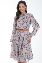 Платье женское полуприлегающего силуэта, выполнено из фактурного трикотажного полотна с рубчиком. Модель без подкладки, без застежки и плечевых накладок. В левом боковом шве обработана шлица с застежкой на 5 петель и 5 декоративных пуговиц. Перед платья асимметричный: с нагрудной вытачкой на левой части переда и планкой с декоративными пуговицами на правой; планка выполнена из гладкого отделочного трикотажного полотна. Спинка с талиевыми вытачками. Круглая горловина оформлена невысокой стойкой. Рукав втачной, длинный.