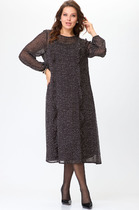 Платье женское, полуприлегающего силуэта, выполнено из гипюра и плательной ткани «сатин». Перед и спинка состоят из двух разных по длине слоев: нижний короче верхнего на 5 см. Модель без подкладки, с плечевыми накладками. Низ платья и рукавов оформлен фестонами. Перед в верхнем и нижнем слоях с нагрудными вытачками, выходящими из пройм. Спинка с талиевыми вытачками и средним швом, в верхней части которого обработана застежка на потайную тесьму-«молнию» (50см), в нижней – разрез.  Вырез горловины переда и спинки округлый, углубленный по переду. Рукав короткий, втачной. Верхний и нижний слои платья скреплены по среднему шву, плечевым и проймам. Длина платья (верхний слой)-108 см, длина рукава-26 см.