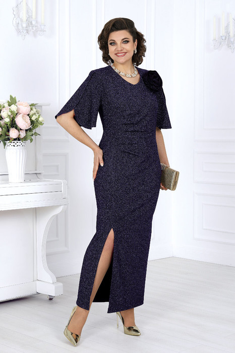 Платье женское полуприлегающего силуэта, выполнено из трикотажного полотна с фактурной лицевой стороной «люрекс». Модель на трикотажной подкладке, с плечевыми накладками. В левом боковом шве расположена застежка на потайную тесьму-«молнию» (35 см). Перед платья со смещенным к боковому шву рельефом, идущим от проймы до низа; в нижней части рельефа обработан разрез. Левая часть переда отрезная по линии талии, с односторонними горизонтальными складками, направленными от рельефа к центру. Спинка с талиевыми вытачками. Горловина спинки округлая, по переду V-образная, углубленная. Рукав короткий, втачной, формы «крылышко на запах», со скругленными срезами. Платье дополнено съемным «цветком» из основного полотна. Длина платья - 136 см; длина рукава - 34 см.