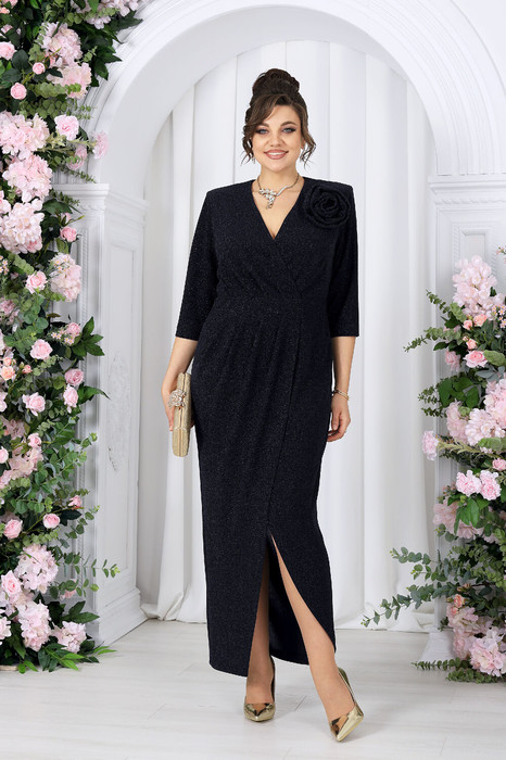 Платье женское полуприлегающего силуэта, выполнено из трикотажного полотна с фактурной лицевой стороной «люрекс». Модель на трикотажной подкладке, с плечевыми накладками. На правой части переда, вдоль отрезного пояса, заложены косые односторонние складки; детали лифа и юбки скреплены на запах. Низ платья асимметричный: правая часть переда -- удлинена к центру и оформлена углом, левая -- скругленная и входит в правый боковой шов. На спинке обработаны талиевые вытачки. В левом боковом шве предусмотрена застежка на потайную тесьму-«молнию» (35 см). Рукав длиной 3/4, втачной. Платье дополнено съемным «цветком» из основного полотна. Длина платья-138 см; длина рукава-41 см.