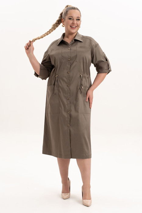Платье офисное повседневное представляет собой идеальный выбор для женщин ищущих комфорт и стиль в ежедневной одежде. Это платье-плащ с застёжкой на петли и пуговицы, поясом на  кулисе, добавляющими удобство в носке и возможность адаптации к различным фигурам. Благодаря универсальности, наряд можно носить и на работу, в офис, на прогулку и в ресторан. По спинке имеется средний шов, шлица и отлитная кокетка в верхней части спинки. Особенностью этой модели является декоративная кокетка , напоминающая плащ. Длинные рукава с манжетами и патами на петли и пуговицы, что позволяет регулировать длину рукава, гармонично дополняют классический фасон платья  с воротником рубашечного типа. Большие накладные карманы и маленькие нагрудные по переду платья добавляют удобства в носке.Свободный оверсайз силуэт делает это платье универсальным.  Такое платье призвано подчеркнуть природную женскую красоту и грацию, а также безупречный вкус его обладательницы.