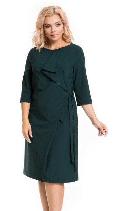 Элегантное платье прямого силуэта, выполнено из эластичной плательной ткани Ниагара. По переду застрочена глубокая фигурная складка, образующая оригинальный волан. Фигуру можно подчеркнуть мягкими полупоясами с завязывающимися концами, расположенными в боковом шве и шве застрачивания складки переда. Спинка с двумя с вертикальными вытачками, средним швом и шлицей длиной 28 см. Круглый вырез горловины переда и спинки обработан обтачкой. Рукав втачной, прямой. Длина рукава от плечевой точки в 46 р-ре – 40 см., в 56 р-ре – 42 см., обхват рукава по низу в 46 р-ре – 26 см., в 56 р-ре – 32 см. Платье без подкалада и застежек. Длина по спинке в 46 р-ре – 102 см. в 56 р-ре – 104 см.