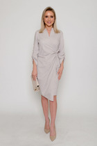 Спущенная линия плеча создаёт популярный рукав - летучая мышь, V-образный вырез горловины деликатно приоткрывает линию шеи и декольте.