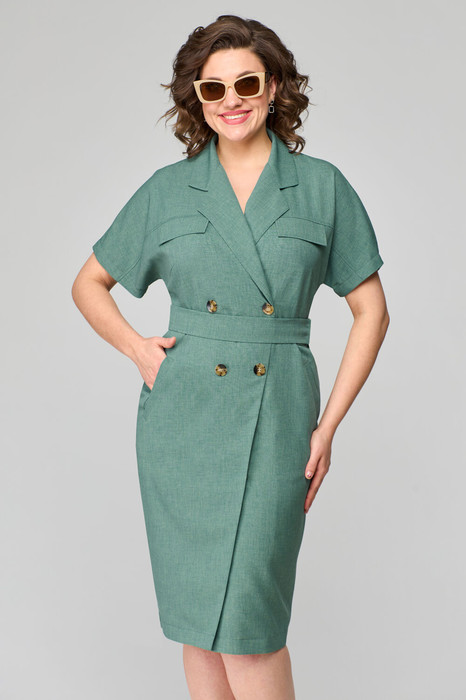 Платье женское, полуприлегающего силуэта, покроя спущенное плечо, с двубортной застежкой на запАх. На переде и спинке горизонтальная кокетка, по спинке средний шов. Горловина оформлена воротником пиджачного типа.