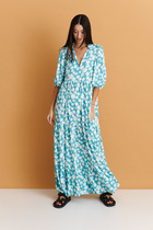 Платье женское А-образного силуэта (расширенное к низу) втачного покроя с центрально-бортовой застежкой на планку, на петли-пуговицы. Платье выполнено из ткани двух контрастных цветов. Рукав одношовный. Спинка со средним швом и кокеткой, горизонтально направленная. Перед ассиметричный. Правая часть состоит из верхней и нижней частей. В верхней части расположен накладной карман с клапаном и отделочной деталью. В боковых швах расположены карманы. К платью прилагается пояс из основной ткани с фурнитурой в цвет золота. Пуговицы металлические также имитируют золото.