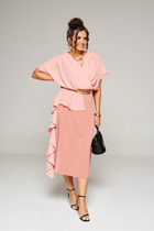 Платье женское полуприлегающего силуэта, втачного покроя рукава, выполнено из костюмной ткани с шифоновыми рукавами с металлизированной нитью. По переду отрезное по линии талии, верхняя часть, верхняя часть на подкладке, состоит из кокетки и лифа со складками, идущими на запах. Горловина «V - образной» формы. Спинка с талиевыми вытачками и средним швом, в котором разрез и застежка на тесьму-молнию. Рукав одношовный, длинный со сборкой по окату и собранный на резинку по низу. Дополнением служит пояс с пряжкой из основной ткани.