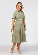 Серое платье из футера с лайкрой. Рукава чуть выше запястий, общая длина чуть выше коленей. Геометрические узоры, в воротник вдет серый шнурок. Размеры от 42 до 56. Имеется возможность розничного приобретения данного товара.