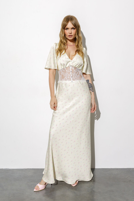 Платье-комбинация длины макси с кружевным широким поясом.