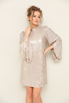 Модель с фигурным подрезом ниже линии талии. В верхней части переда застёжка на пуговицы. Нижняя часть платья со сборкой. В боковых швах высокие разрезы. По низу рукава отложная манжета с петлёй и пуговицей.